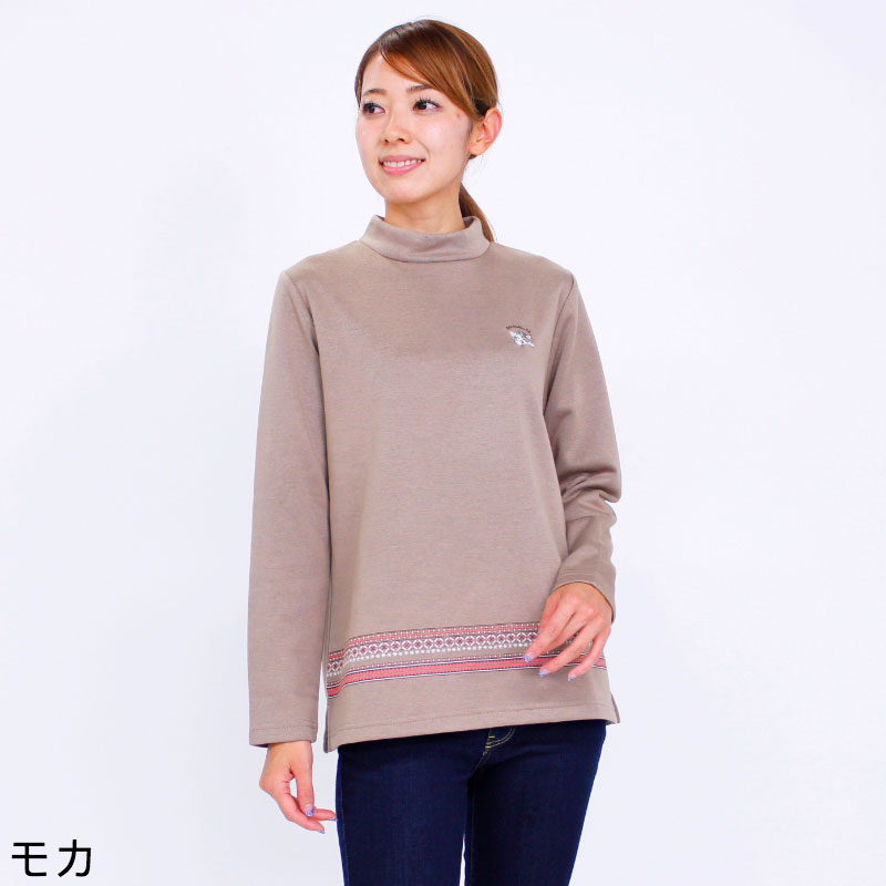 アウトレット! Tシャツ 長袖 GuGu World(グーグーワールド) 裏ベロア裾プリントハイネックロングTシャツ レディース グレーネコの刺繍 丈長め M L LL 3L 4L ベージュ モカ ネイビー グレー 初春 「201849w」