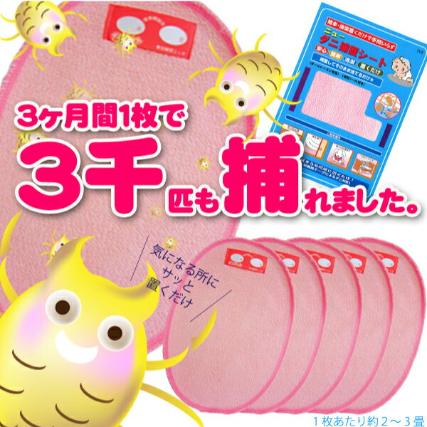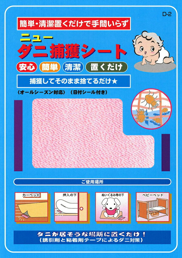 ダニ捕獲シートは清潔なお家の味方 あなたの家は大丈夫? 品名 ニューダニ捕獲シート 色柄 ピンク 材質 コットン100% 成分:誘引剤・食品添加物・粘着剤・スフ・ゴム系粘着剤 生産国 日本製[made in Japan] サイズ 1枚17.5cm×26cm 販売元 株式会社メイダイ 商品のポイント ■特徴■ ダニ捕り用に開発された特殊誘引剤に 誘われたダニが棉生地の中に入り強力粘着剤に ひっついて一網打尽に捕獲するシートです。