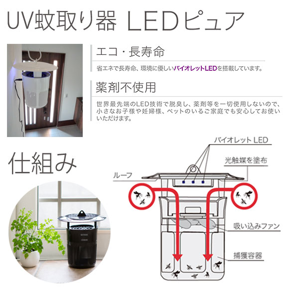 【UV蚊取り器 MOSピュア 蚊の習性を科学的に解明し、安全に捕獲】 化学薬品やUVランプ(水銀)を使用せず、波長365nmの近紫外線で蚊を捕獲する、人や環境にやさしい光方式の蚊取り器です。