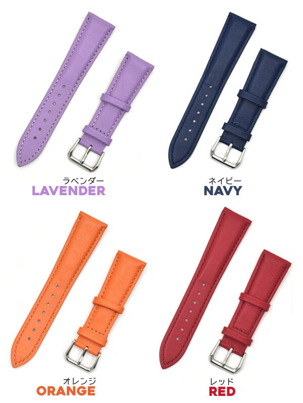 メール便送料無料【22mm 時計用本革ベルト】シープスキン 本革 本皮 羊革 羊本革 カラフル 尾錠付属 シルバー金具 ウォッチ メンテナンス 時計ベルト ネイビー ラベンダー レッド オレンジ グリーン ダークブラウン ホワイト ブラック